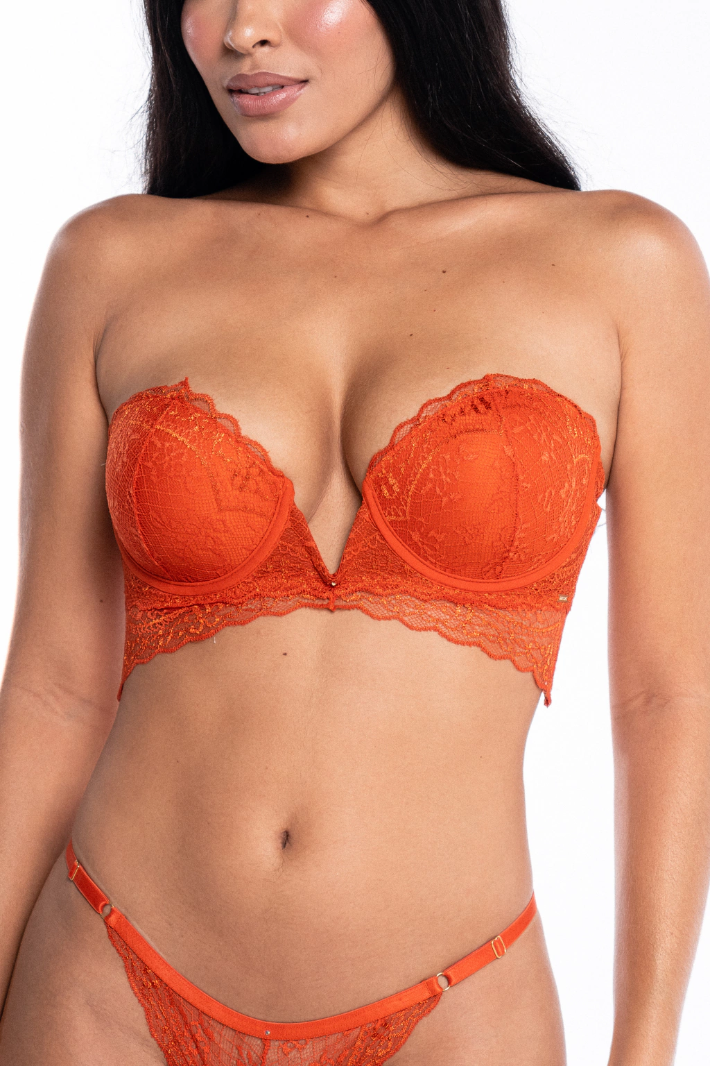 Sutiã modelo tomara que caia, com decote em V e barbatanas nas laterais.
